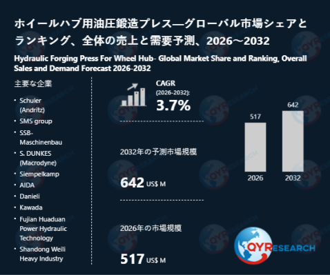 2026年3月26日に、QY Research株式会社(所在地:東京都中央区)は、「ホイールハブ用油圧鍛造プレス―グローバル市場シェアとランキング、全体の売上と需要予測、2026~2032」の最新調査資料を公開しました。本レポートは、ホイールハブ用油圧鍛造プレス市場の規模推移、成長トレンド、競争構造、地域動向、主要企業ランキングを体系的に整理し、市場全体の構造を明確化します。主要企業の市場シェアや競争戦略を軸に、売上、価格動向、需要予測データを分析し、現状把握と将来展望を提示します。2026~2032年の成長見通しを定量・定性の両面から検証し、企業の競争力強化と市場戦略高度化に資する実践的インサイトを提供します。