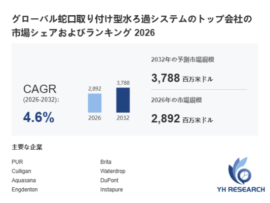 YHResearch調査チームの最新レポート「グローバル蛇口取り付け型水ろ過システムのトップ会社の市場シェアおよびランキング 2026」によると、2026年の2892百万米ドルから2032年には3788百万米ドルに成長し、2026年から2032年の間にCAGRは4.6%になると予測されています。