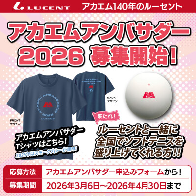アカエム140年の株式会社ルーセント(本社:千葉県柏市、代表取締役社長:中野吉広)は2026年3月6日、国内シェアNo.1のソフトテニス公認球「アカエムボール」を使って、ルーセントと一緒に全国でソフトテニスを盛り上げてくれるソフテニユーザー『アカエムアンバサダー2026』の募集を開始いたしました。応募方法や概要は下記URLからご確認ください。