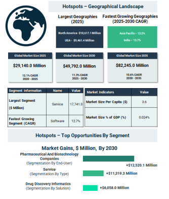 ライフサイエンス情報技術市場における機会は、データ、規模、用途が交差する領域に集中している。サービス分野は最大の成長を生み出し、2030年までに年間売上で11,319.3百万ドルの増加が見込まれている。