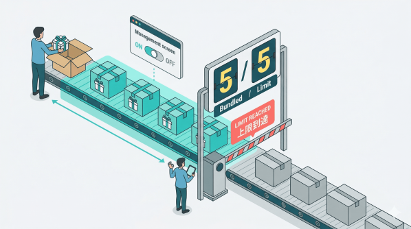 ・端数もきっちり処理。たとえば残り同梱可能数が2個の状態で、条件に合致した注文に4個追加すべきケースでも、追加されるのは2個。上限を超えて同梱されることはありません(※2個で足りる注文を待って適用するような挙動ではなく、条件合致した注文に対して残数分だけ追加されます)。