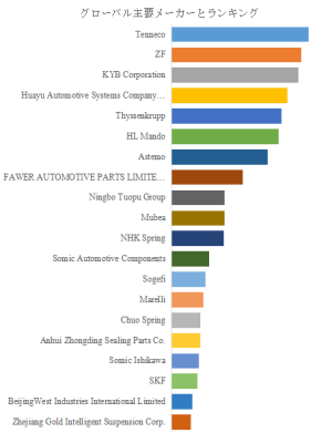 本市場は明確な上位企業群によって構成されている。Tenneco、ZF、KYB Corporationがグローバル市場を牽引し、長年のOEM取引実績と幅広い製品ポートフォリオを背景に高いシェアを維持している。ZFはシャシーシステム全体を統合する戦略を進め、電動化・電子制御対応で存在感を強めている。KYBは量産対応力と品質信頼性で日系・グローバルOEM双方から高い評価を受けている。