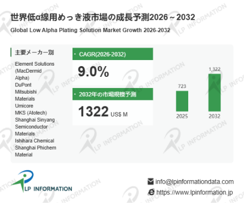 LP Information調査チームの最新レポートである「世界低α線用めっき液市場の成長予測2026~2032」(https://www.lpinformation.jp/reports/693059/low-alpha-plating-solution)によると、低α線用めっき液市場は、2032年に13.22億米ドルへ到達し、2026~2032年にCAGR9.0%で拡大する見通しであるが、成長の中身は用途と等級の二軸で読み解く必要がある。需要はハイグレードパッケージングへ集約し、フリップチップが最大用途として市場シェア53%を占め、バンピング工程で低αSn-Agめっき液が広く用いられる。等級別ではウルトラ低αが2024年に価値ベース44%を占めて基盤グレードとして定着する一方、スーパー・ウルトラ低αは2024年に市場規模14%ながら成長率10.22%で伸長し、技術的高地として存在感を強める構図である。