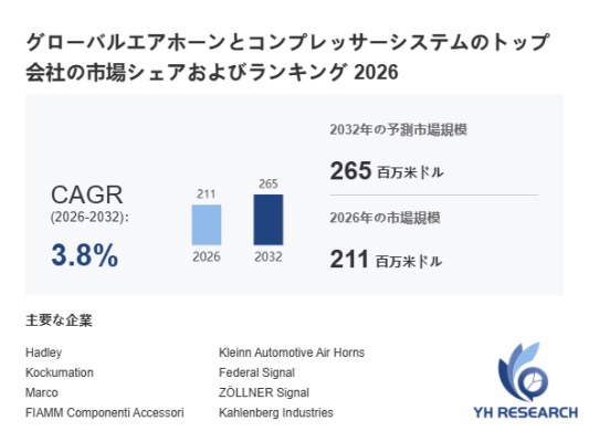 YHResearch調査チームの最新レポート「グローバルエアホーンとコンプレッサーシステムのトップ会社の市場シェアおよびランキング 2026」によると、2026年の211百万米ドルから2032年には265百万米ドルに成長し、2026年から2032年の間にCAGRは3.8%になると予測されています。