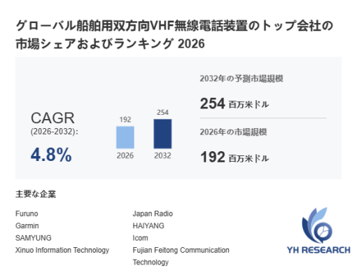 本記事は、YH Researchが発行したレポート「グローバル船舶用双方向VHF無線電話装置のトップ会社の市場シェアおよびランキング 2026」 を紹介しています。