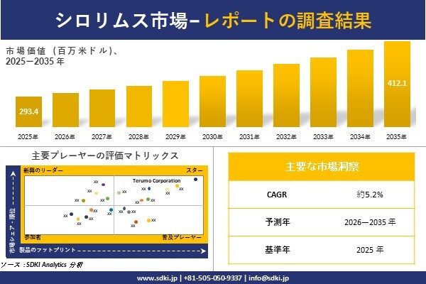 SDKI Analytics(本社:東京都渋谷区)は、このたび、2026年03月23に「シロリムス市場調査レポート:2026-2035年の市場規模、シェア、傾向の予測」を発表しました。シロリムスに関する市場調査レポートには、統計的および分析的アプローチを使用した予測評価が含まれています。この調査レポートでは、一次および二次調査方法を使用して分析された主要な業界洞察を通じて将来の傾向を理解できるようにすることで、主要な市場動向を読者に説明しています。