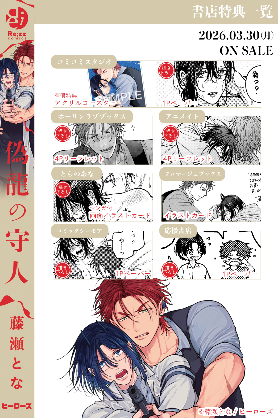 株式会社ヒーローズ(本社:東京都千代田区、代表取締役:白井勝也)はBLレーベル・Re;zzコミックスの第三弾として、『偽龍の守人』(著:藤瀬とな)と『忘れた春は君隣り』(著:こみち)を2026年3月30日(月)に発売いたします。また、発売を記念した「Re;zzコミックス刊行記念フェア」第二弾も同日スタートいたします。