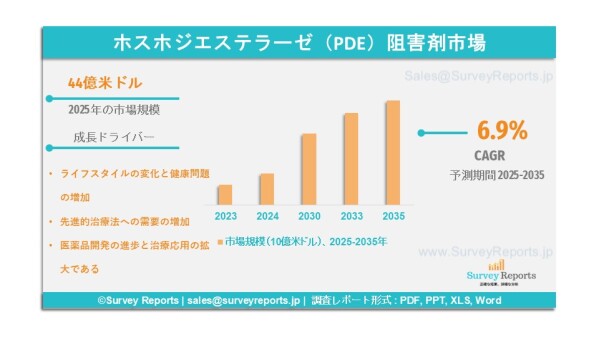 Surveyreportsの専門家による分析によれば、ホスホジエステラーゼ(PDE)阻害剤市場規模は2025年に44億米ドルであった。また、2035年末までに82億米ドルに達すると予測されている。さらに、2025年から2035年の予測期間において、年平均成長率(CAGR)は約6.9%で成長すると見込まれているものである。