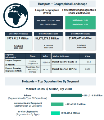 医療機器市場は2025年に773,912.7百万ドルに達し、診断および治療用途全体にわたる安定した需要に支えられた力強い拡大を示した。今後、市場は2030年までに1,176,374.2百万ドル、さらに2035年までに1,808,403.4百万ドルへと成長すると予測されている。この成長は、医療投資の増加だけでなく、臨床成果と運用効率を向上させる高度技術への依存が高まっていることを示している。