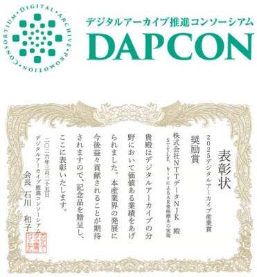 株式会社NTTデータNJK(東京都中央区、代表取締役社長 小寺 基夫、以下「NTTデータNJK」)は、XRプラットフォーム「STYLY.biz」を活用したAR骨格標本の取り組みが、2026年3月25日に開催された授賞式において、「2025 デジタルアーカイブ推進コンソーシアム デジタルアーカイブ産業賞 奨励賞」を受賞したことをお知らせします。