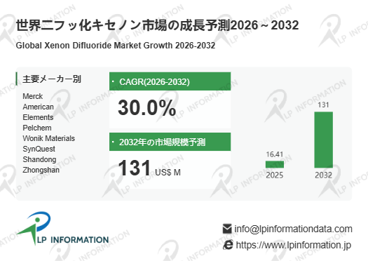 LP Information調査チームの最新レポートである「世界二フッ化キセノン市場の成長予測2026~2032」(https://www.lpinformation.jp/reports/588683/xenon-difluoride)によると、2026年から2032年の予測期間中のCAGRが30.0%で、2032年までにグローバル二フッ化キセノン市場規模は1.31億米ドルに達すると予測されている。この成長の背景には、半導体産業における先端プロセスの普及とMEMS市場の拡大がある。先端デバイスの微細構造形成には極めて高い純度と制御性が求められ、二フッ化キセノンの独自性が競争優位を生む原動力となっている。また、先端パッケージングや異種集積化の進展も、二フッ化キセノン需要を後押ししている。一方で、キセノン原料の希少性、高純度化プロセスの製造コスト、危険物物流の高度な安全要件は市場拡大の制約要因として存在している。特にキセノン自体の大気中濃度は極めて低く、原料調達の地政学的リスクが供給の弾力性を制限している。また、輸送時の国際危険物規則への対応や工場内EHS(環境・健康・安全)体制の強化がコスト構造を押し上げるリスクとして業界全体に影響を与えている。こうした制約にもかかわらず、応用価値と需要の拡大が市場を押し上げる力となっている点は見逃せない。