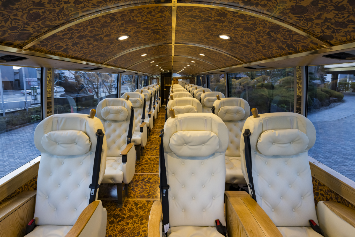神姫バスではこだわりのある上質な旅、「真結(ゆい)ツアー」を企画しており、2024年からはインバウンド向けのツアー展開もしております。特別車両「YUI PRIMA OLIVIA」は、世界的工業デザイナー水戸岡鋭治氏が手掛け、大型バスでありながら21席のゆとりある座席配置で快適な移動環境を実現しています。英語対応可能な専属のアテンダントスタッフによる車内での無料ドリンクサービス(アルコールを含む)や言語サポートを通じて、「移動時間そのものを旅のハイライト」と感じていただけるよう上質な旅をご準備しております。