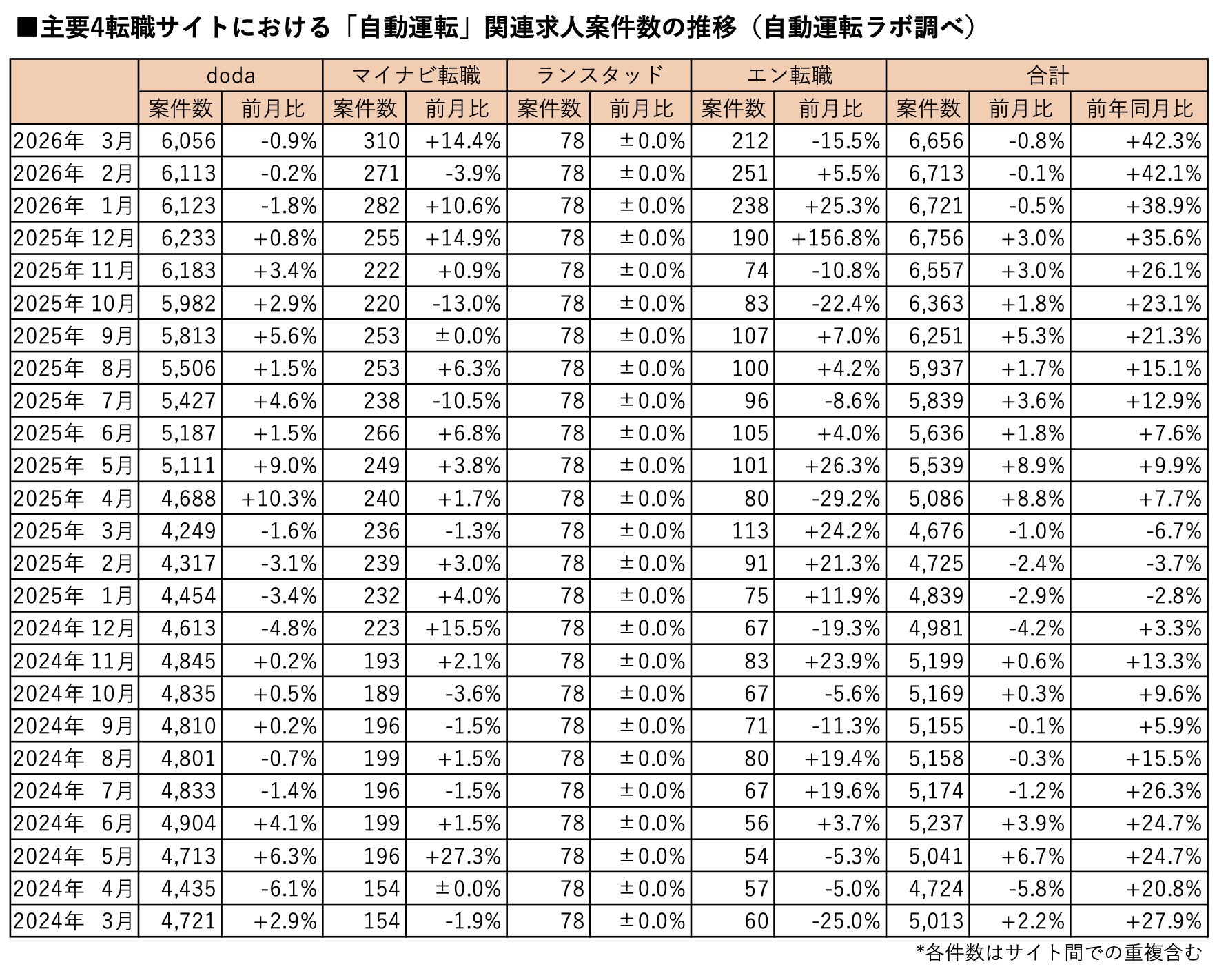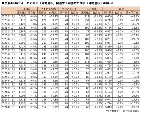 一方で、Googleなどをはじめ自動運転技術を活用したロボタクシーを展開する計画などは引き続き盛り上がりを見せており、今後も求人件数は堅調な動きとなるとみられます。