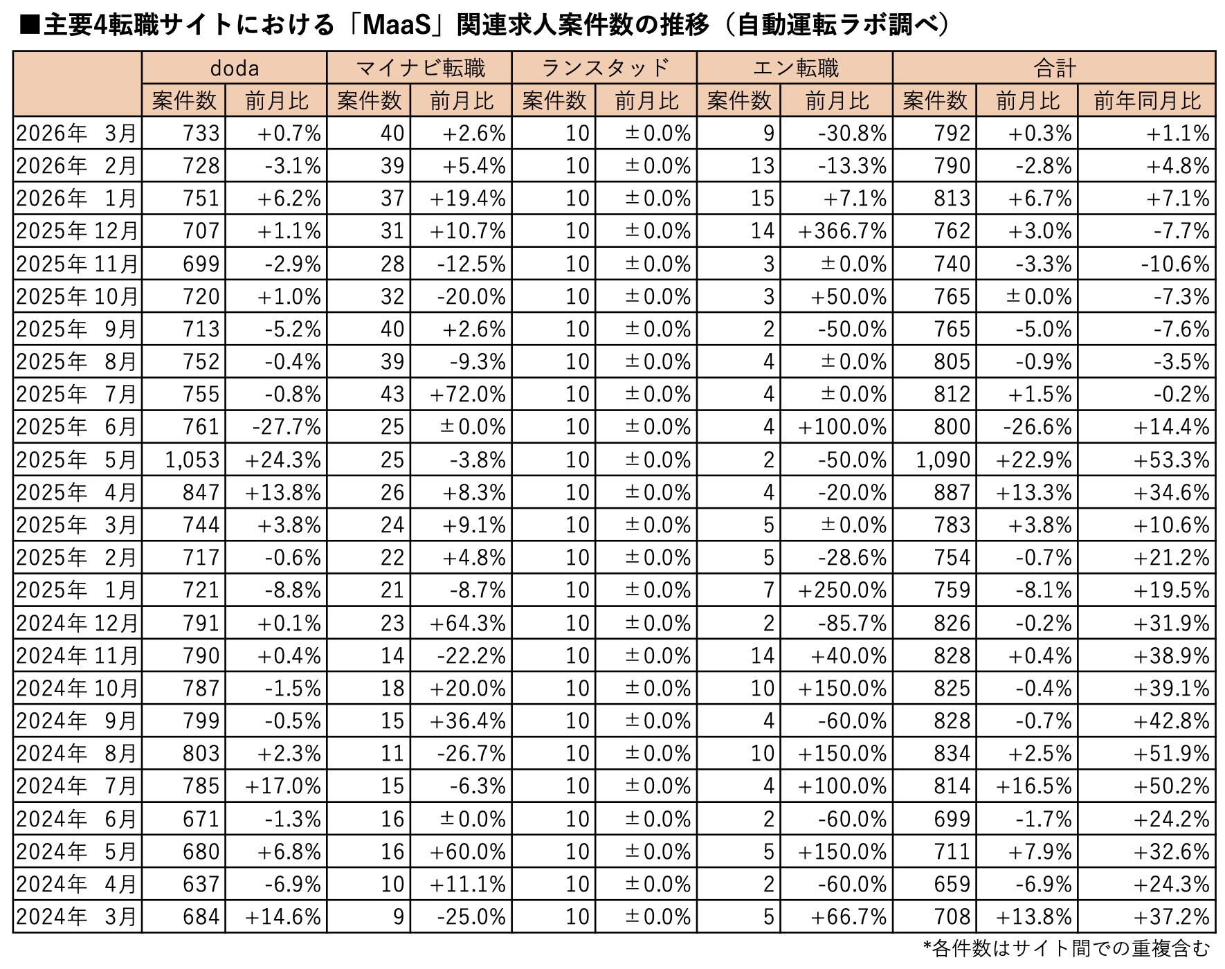 「MaaS」の関連求人案件数(主要転職4サイト)は、前月比0.3%増、前年同月比1.1%増の792件となりました。