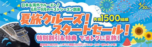 本セールは先着1,500組様限定で、日本発着・海外発着を問わず、人気クルーズを特別割引・特典付きでご案内いたします。