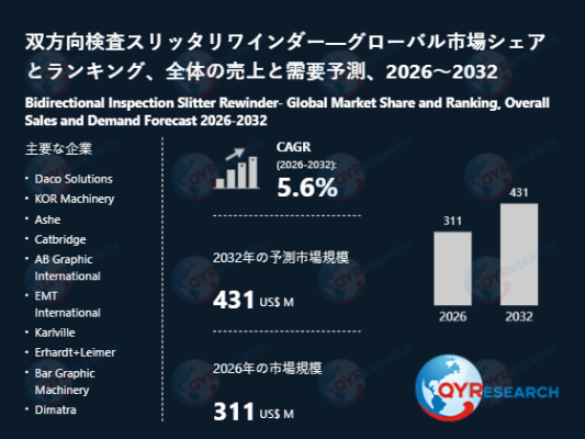 QY Research株式会社(所在地:東京都中央区)は、「双方向検査スリッタリワインダー―グローバル市場シェアとランキング、全体の売上と需要予測、2026~2032」に関する最新調査レポートを公開しました。本レポートでは、双方向検査スリッタリワインダーの世界市場を対象に、市場規模、販売数量、価格推移、市場シェア、主要企業の競争ポジションを体系的に整理し、地域別・国別の動向に加えて、製品タイプ別および用途別の詳細セグメント分析を掲載しています。さらに、2021年から2032年までのデータを基に市場の中長期的な成長軌道を検証し、将来的な拡大余地や投資機会を提示するとともに、競争環境の構造変化や企業戦略の方向性、業界が直面する課題についても多面的に考察しています。