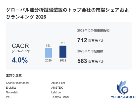 YHResearch調査チームの最新レポート「グローバル油分析試験装置のトップ会社の市場シェアおよびランキング 2026」によると、2026年の563百万米ドルから2032年には712百万米ドルに成長し、2026年から2032年の間にCAGRは4.0%になると予測されています。