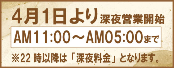 営業時間:11:00~05:00(最終受付04:30) 年中無休