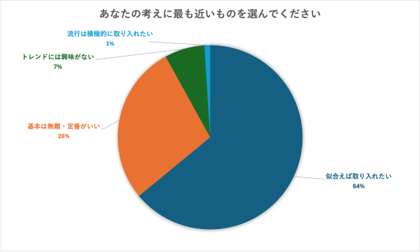 しかし興味深いのは、「似合えば取り入れたい」と考えている人が64%と多数派である点です。つまり、トレンドそのものを否定しているわけではなく、“自分に似合うかどうか”を最優先にしている傾向が見て取れます。