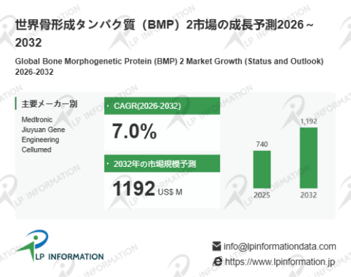 LP Informationの最新レポート「世界骨形成タンパク質(BMP)2市場の成長予測2026~2032」(https://www.lpinformation.jp/reports/577827/bone-morphogenetic-protein--bmp--2)によれば、2026年から2032年の予測期間中、グローバル骨形成タンパク質(BMP)2市場はCAGR7.0%で順調に拡大し、2032年には11.92億米ドルに達すると予測されている。