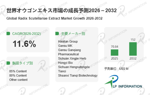 LP Information調査チームの最新レポートである「世界オウゴンエキス市場の成長予測2026~2032」(https://www.lpinformation.jp/reports/601290/radix-scutellariae-extract)によると、2026年から2032年の予測期間中のCAGRが11.6%で、2032年までにグローバルオウゴンエキス市場規模は1.52億米ドルに達すると予測されている。世界の植物性エキス市場は近年、健康志向の高まりや“クリーンラベル”トレンドの影響を受け、機能性食品、化粧品、栄養補助食品といった多様な用途で拡張している。