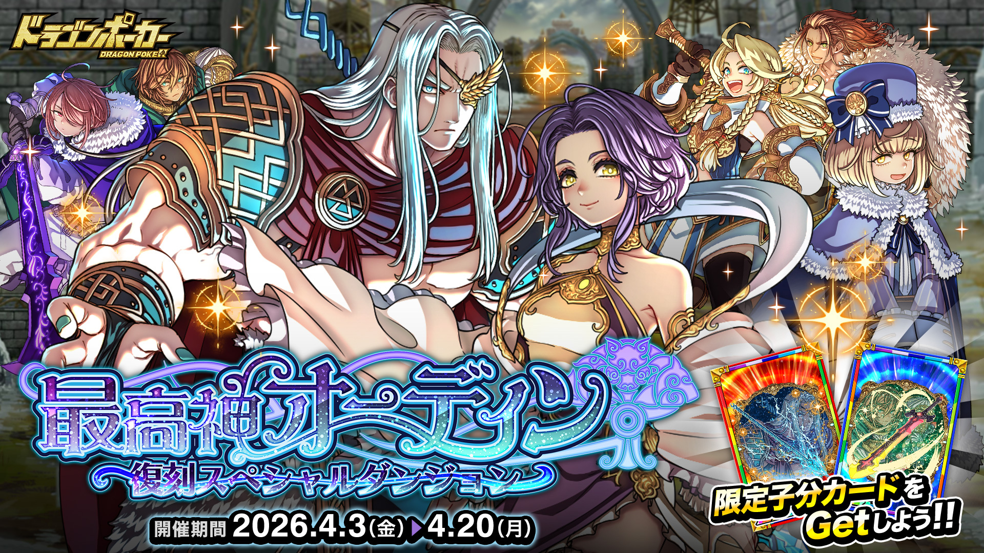 株式会社アソビズム(本社:東京都千代田区、代表取締役:大手智之)は、App Store・Google Playにて好評配信中のリアルタイム合体カードバトル『ドラゴンポーカー』で、2026年4月3日(金)より復刻スペシャルダンジョン「最高神オーディン」を開催いたします。