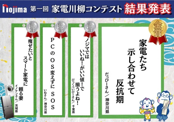 株式会社ノジマ(代表執行役社長・野島廣司)は、2025年12月1日~2026年2月28日にかけて実施した「第一回 ノジマ家電川柳コンテスト」の受賞作品を決定しました。本コンテストは、家電にまつわる“あるある”や共感できる日常のひとコマを川柳として募集し、当社と家電製品についてより身近に感じていただくための新たな取り組みとなりました。応募総数3,599句の中から、金賞をはじめとする受賞作品14句を発表いたします。
