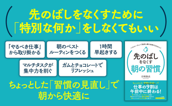 新刊書籍『先のばしをなくす朝の習慣』(著者:印南 敦史)を4月17日(金)に発売いたします。