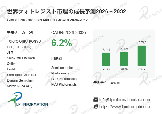 LP Information調査チームの最新レポートである「世界フォトレジスト市場の成長予測2026~2032」(https://www.lpinformation.jp/reports/593001/photoresists)によると、2026年から2032年の予測期間中のCAGRが6.2%で、2032年までにグローバルフォトレジスト市場規模は107.62億米ドルに達すると予測されている。成熟した主要用途、価格競争の激化、景気サイクルの影響を受け、一時的な伸び悩みが顕在化している。しかし、2026年以降はムーアの法則的微細化の継続、高NA EUV対応製品など先端プロセス需要の本格化により、2032年には10678百万米ドルへ成長し、年平均成長率は5.6%へ回帰する予測である。各種市場調査でも、先端リソグラフィ材料全体が長期的に強い需要増加の姿勢を維持すると評価されている。
