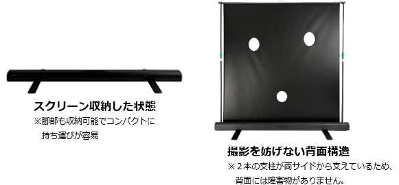 自立式のスクリーン構造により、設置場所を選ばず、短時間で容易に撮影環境を構築可能。