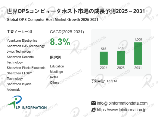 LP Information調査チームの最新レポートである「世界OPSコンピュータホスト市場の成長予測2025~2031」(https://www.lpinformation.jp/reports/65160/ops-computer-host)によると、2025年から2031年の予測期間中のCAGRが8.3%で、2031年までにグローバルOPSコンピュータホスト市場規模は10億米ドルに達すると予測されている。この市場の特徴は、デジタルサイネージ、教育端末、商業展示、公共インフラ向けなど多用途にわたり、標準化規格に準拠した高互換性製品が求められる点である。また、長時間稼働・高信頼性・低消費電力・拡張性といった性能要求が顕著であり、製品の機能・性能差が市場競争に直結する。市場構造としては、高い技術参入障壁により限られた企業が優位性を確保しており、製品開発・品質管理・サポート体制の充実度が競争力を決定づける要因となる。さらに、スマートシティや教育ICT投資の拡大に伴い、用途別にカスタマイズされた高性能モジュール製品への需要が増加しており、市場は量的拡大だけでなく、技術・性能面での高度化を伴う成長市場としての性格を強めている。