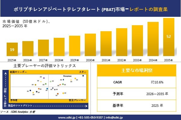 SDKI Analytics(本社:東京都渋谷区)は、このたび、2026年04月06に「ポリブチレンアジペートテレフタレート (PBAT)市場調査レポート:2026-2035年の市場規模、シェア、傾向の予測」を発表しました。ポリブチレンアジペートテレフタレート (PBAT)に関する市場調査レポートには、統計的および分析的アプローチを使用した予測評価が含まれています。この調査レポートでは、一次および二次調査方法を使用して分析された主要な業界洞察を通じて将来の傾向を理解できるようにすることで、主要な市場動向を読者に説明しています。