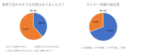 3月に開催したセミナー終了後に受講者アンケートを実施。「業務で活かせそうな内容はありましたか?」との質問に対し、約4割が「すぐに活用できそう」、約6割が「活用できそうな点がある」との回答をいただき、セミナー受講の満足度についても「大変満足」が約7割、「やや満足」が約3割と高い評価をいただきました。