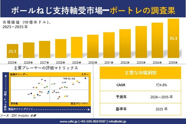 SDKI Analytics(本社:東京都渋谷区)は、このたび、2026年04月07に「ボールねじ支持軸受市場調査レポート:2026-2035年の市場規模、シェア、傾向の予測」を発表しました。ボールねじ支持軸受に関する市場調査レポートには、統計的および分析的アプローチを使用した予測評価が含まれています。この調査レポートでは、一次および二次調査方法を使用して分析された主要な業界洞察を通じて将来の傾向を理解できるようにすることで、主要な市場動向を読者に説明しています。