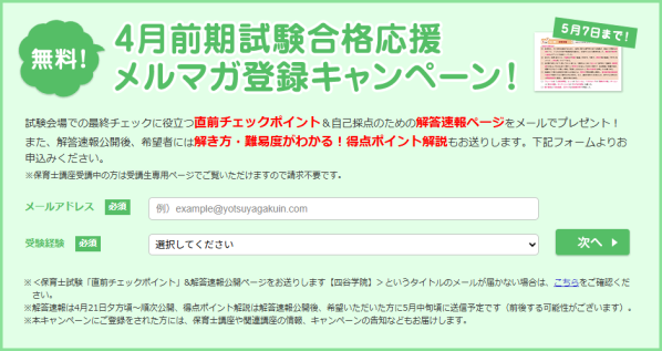 無料プレゼントの対象になるのは、 4月3日から5月7日の間に保育士講座のホームページからメールアドレスを登録された方です。解答速報は、登録時のメールアドレスに公開ページをお送りさせていただきます。