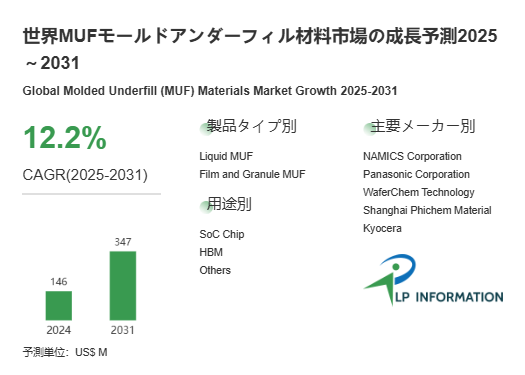LP Information調査チームの最新レポートである「世界MUFモールドアンダーフィル材料市場の成長予測2025~2031」によると、2025年から2031年の予測期間中のCAGRが12.2%で、2031年までにグローバルMUFモールドアンダーフィル材料市場規模は3.47億米ドルに達すると予測されている。成長の原動力は、高密度実装・チップレット化・三次元積層技術の進展により、パッケージ内部の応力制御と熱管理が不可欠になっている点にある。また環境規制の強化やリサイクル可能材料への要請は、エポキシベースでありながら環境配慮型材料への開発を促し、新たな競争軸となる。市場の成熟とともに、液状MUF、フィルム型MUF、成形型および複合材料の採用拡大が見込まれ、多様なニーズに応じた製品ポートフォリオの構築が求められる。こうした世界的な需要潮流は、半導体産業全体の高度化と密接にリンクし、MUF材料が次世代パッケージングの基盤素材として成長する構造を形成している。