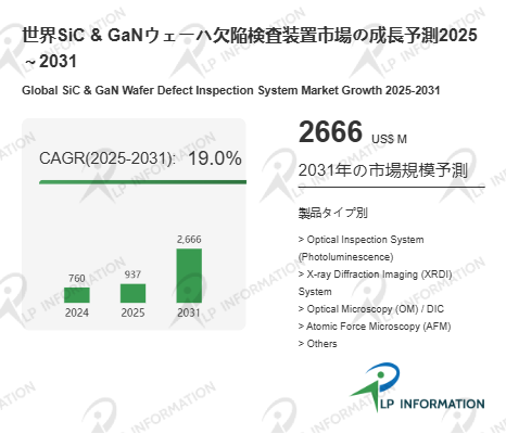 LP Information調査チームの最新レポートである「世界SiC & GaNウェーハ欠陥検査装置市場の成長予測2025~2031」(https://www.lpinformation.jp/reports/551516/sic---gan-wafer-defect-inspection-system)によると、SiC & GaNウェーハ欠陥検査装置市場は、2025~2031年の予測期間中にCAGR 19.0 %で拡大すると予測され、2031年には26.66億米ドルに達する見込みである。市場は一貫して高成長を維持する特性を持ち、先端半導体産業やパワーデバイス用途向けの需要増加が背景にある。地域別や用途別の需要分布は多様であり、単一市場への依存が少ない点も市場の安定性を示している。高付加価値用途が中心となるため、市場規模は比較的大きく、技術依存度の高い成長型市場として構造化されている。全体として、需要の拡大と用途の多様化により、持続的な成長が見込まれる市場である。