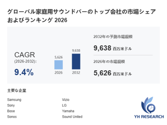 YHResearch調査チームの最新レポート「グローバル家庭用サウンドバーのトップ会社の市場シェアおよびランキング 2026」によると、2026年の5626百万米ドルから2032年には9638百万米ドルに成長し、2026年から2032年の間にCAGRは9.4%になると予測されています。
