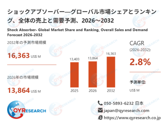 QYResearch調査チームの最新レポート「ショックアブソーバー―グローバル市場シェアとランキング、全体の売上と需要予測、2026~2032」によると、ショックアブソーバーの世界市場は、2025年に13403百万米ドルと推定され、2026年には13864百万米ドルに達すると予測されています。その後、2026年から2032年にかけて年平均成長率(CAGR)2.8%で推移し、2032年には16363百万米ドルに拡大すると見込まれています。