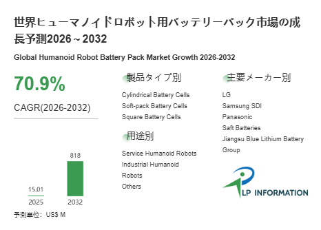 LP Information調査チームの最新レポートである「世界ヒューマノイドロボット用バッテリーパック市場の成長予測2026~2032」(https://www.lpinformation.jp/reports/598767/humanoid-robot-battery-pack)によると、2026年から2032年の予測期間中のCAGRが70.9%で、2032年までにグローバルヒューマノイドロボット用バッテリーパック市場規模は8.18億米ドルに達すると予測されている。2021〜2026年の年平均成長率は262.3%と急峻で、初期導入と試作から量産準備へ一気に移行する段階を示唆する。一方で2026〜2032年、用途が製造・物流・サービス領域へ広がり、稼働時間の延伸や安全要求の高度化に伴って高付加価値パックの比率が高まる構図になりやすい。市場規模の絶対値はまだ小さいが、伸び率が示すのは、供給網と標準化の主導権がこれから固定化されるという事実である。