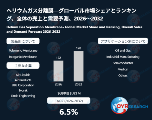 本記事は、QY Research発行のレポート「ヘリウムガス分離膜―グローバル市場シェアとランキング、全体の売上と需要予測、2026~2032」に基づき、市場動向および競合分析の概要を解説します。