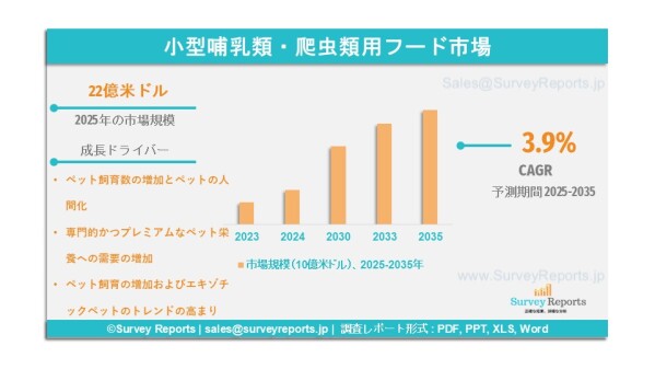Survey Reports LLCは、2026年4月に調査レポートを発表したと公表した。同レポートは、小型哺乳類および爬虫類用飼料市場を対象とし、タイプ別(ウサギ用飼料、げっ歯類用飼料、小型爬虫類用飼料、その他のタイプ)、原料別(動物由来、植物由来)、用途別(ペット専門店、スーパーマーケットおよびハイパーマーケット、コンビニエンスストア、その他の用途)に分類し、2025年から2035年における世界市場の分析、トレンド、機会および予測を提供するものである。本レポートは小型哺乳類および爬虫類用飼料市場の予測評価を示し、成長要因、市場機会、課題および脅威を含む複数の主要な市場ダイナミクスを強調している。