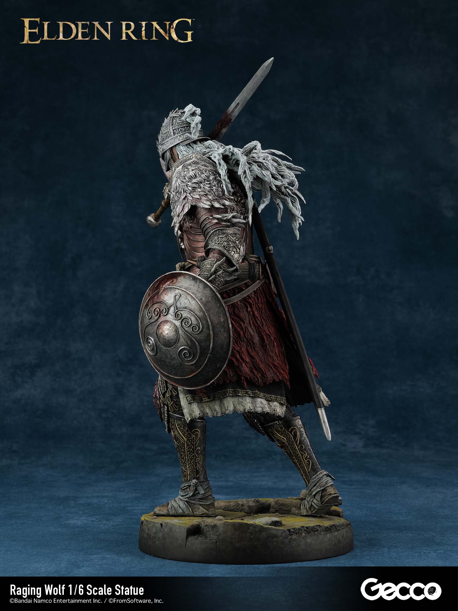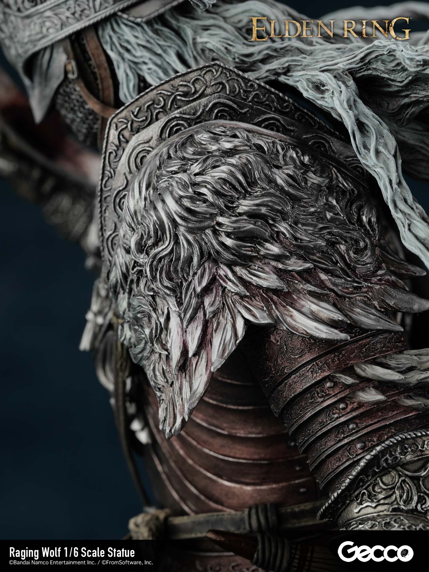 アクションRPG『ELDEN RING』より、戦鬼装備を纏った「褪せ人」が1/6スケールスタチューとして顕現。吹き荒れる向かい風の中、白銀の鬣をなびかせ、何人たりとも寄せ付けない威圧感を放ちながら荒野を征く姿を立体化。