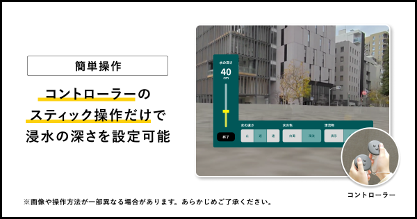 多くのご要望を受け、Meta Quest 3(VR/MRヘッドセット)に対応。現実空間に濁流が重なるMR技術により、水位や流速を自由に調整しながら災害状況をリアルにシミュレーションすることが可能です。視界全体が水没する、没入型の防災体験を提供します。