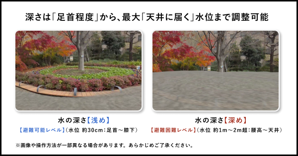 水位が上昇すると足元や床の状況が全く見えなくなるため、「水面下に障害物があるかもしれないリスク」や「なぜ浸水時の避難移動が危険なのか」を、安全な状態で視覚的に理解することができます。