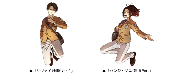 今回のコラボでは、新たに「エレン・イェーガー(制服Ver.)」「ミカサ・アッカーマン(制服Ver.)」「アルミン・アルレルト(制服Ver.)」「アニ・レオンハート(制服Ver.)」「サシャ・ブラウス(制服Ver.)」「ライナー・ブラウン(制服Ver.)」「ベルトルト・フーパー(制服Ver.)」「ジャン・キルシュタイン(制服Ver.)」が登場!
