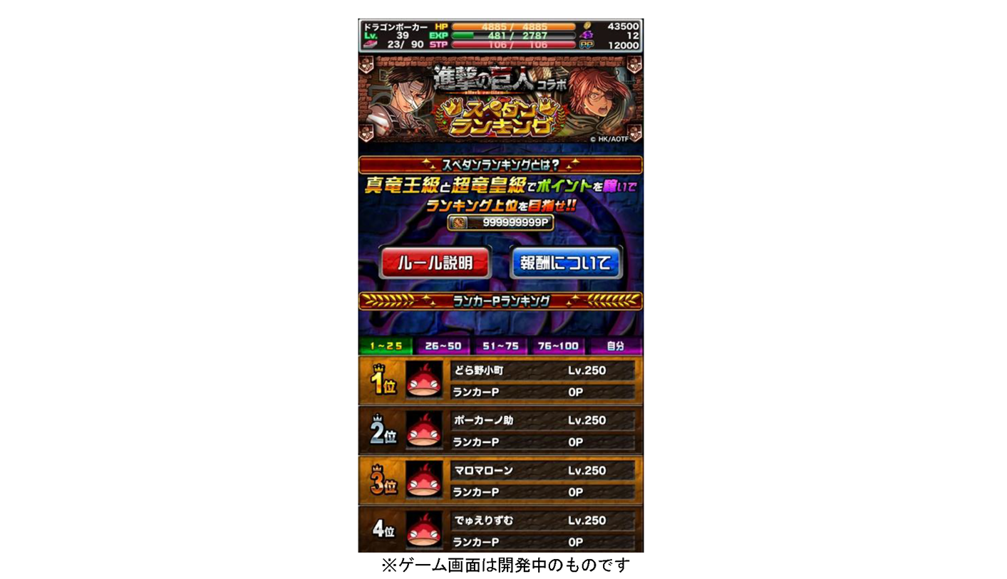 期間中、ゲーム内の特設ページに「スペダンランキング」が表示されます。コラボダンジョンの高難易度「真竜王級」「超竜皇級」にチャレンジして「ランカーP」を集めましょう。参加者には豪華報酬をプレゼント!?みんなで高難易度ダンジョンクリアを目指しましょう!