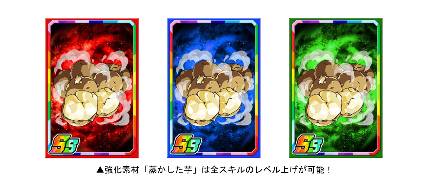 「進撃の巨人P」を使いポイント交換、または素材ガチャを回すと限定強化素材「蒸かした芋」を入手できます。育成したいカードの経験値がアップするだけでなく、全スキルのレベル上昇率がアップします。