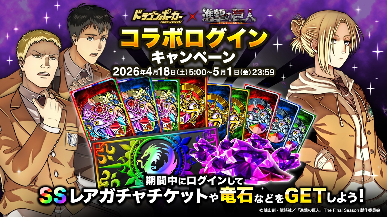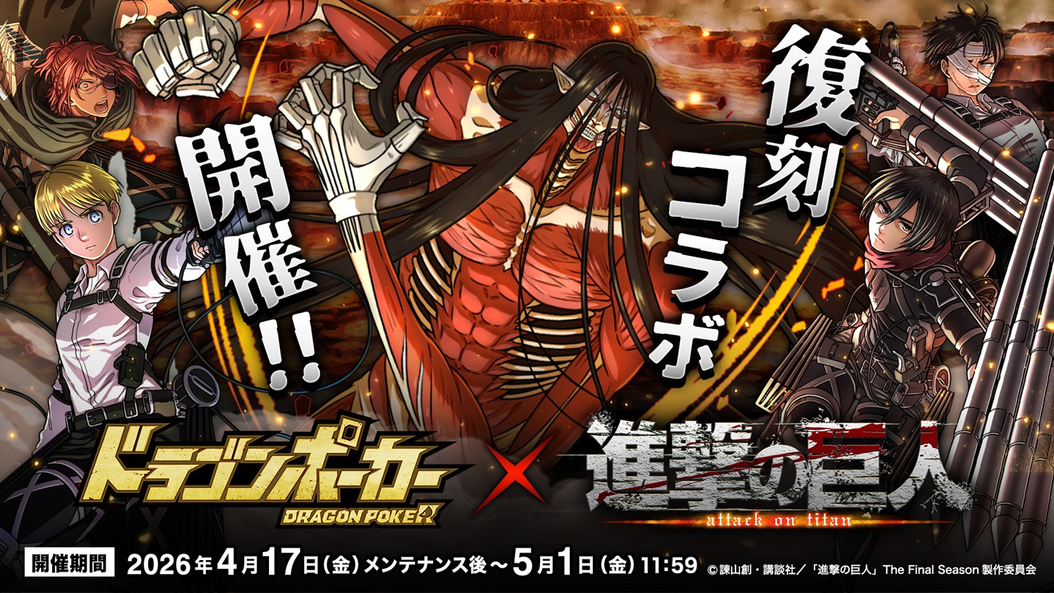株式会社アソビズム(本社:東京都千代田区、代表取締役:大手智之)は、App Store・Google Playにて好評配信中のリアルタイム合体カードバトル『ドラゴンポーカー』で、2026年4月17日(金)よりTVアニメ『進撃の巨人』とのコラボイベントを開催いたします