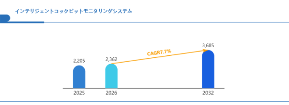 Global Reports調査チームの最新レポート「グローバルインテリジェントコックピットモニタリングシステム市場規模、主要企業シェア、ランキング分析レポート【2026年版】」によると、2026年の2362百万米ドルから2032年には3685百万米ドルに成長し、2026年から2032年の間にCAGRは7.7%になると予測されています。